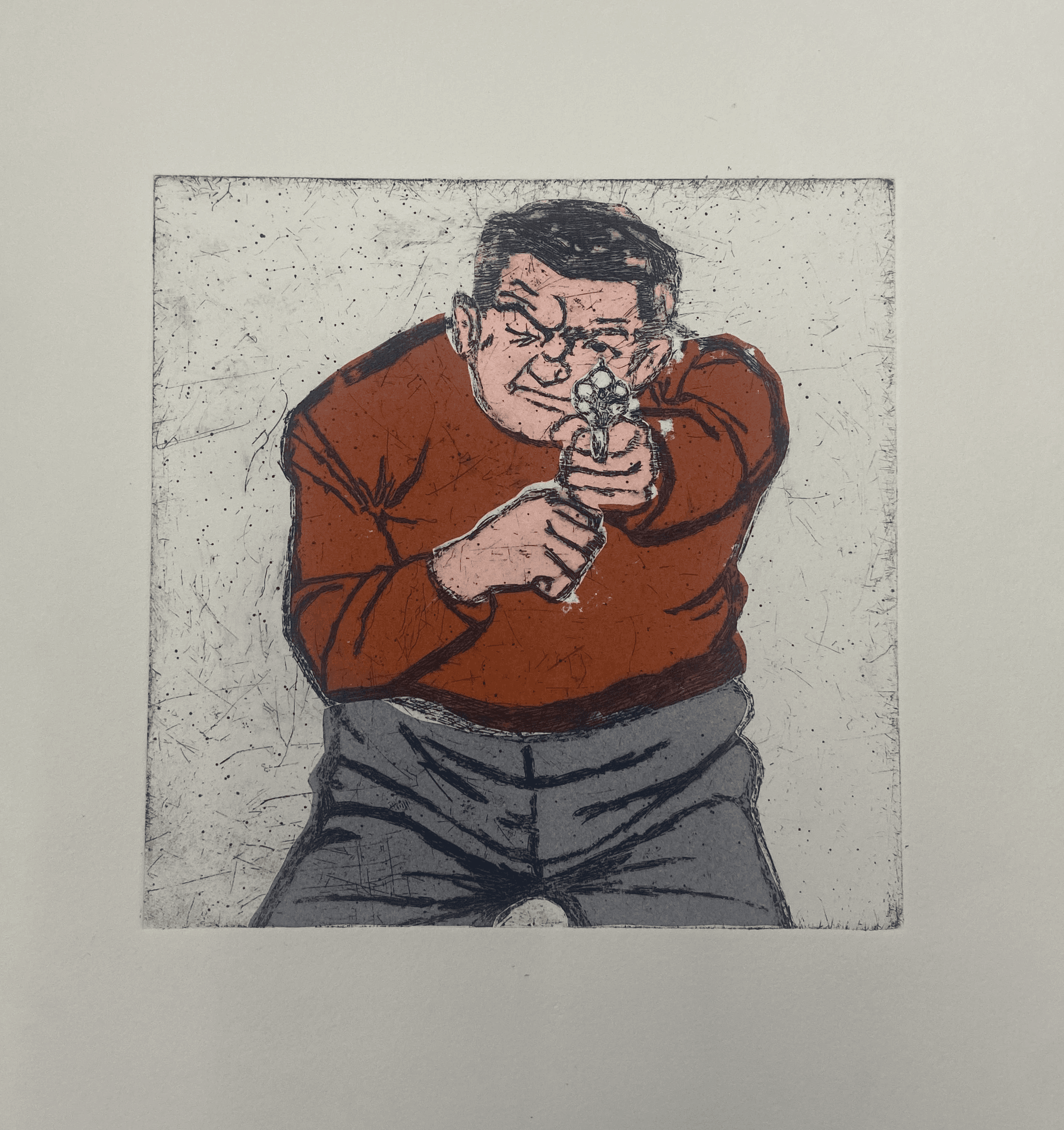 The Chine Collé process can make or break your project. The process is long but the results are beautiful. With this design I wanted to do something fun that would show the different layers of tissue paper. With copper plate printing you can get extremely subtle lines that are barely visible until printed. This design is reminiscent of comic book illustrations using three different layers of paper, pressed together with wood glue, layered on top of the inked copper plate. I'm very satisfied with the result considering none of the delicate papers had ripped or overlapped incorrectly while printing.