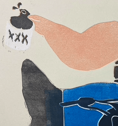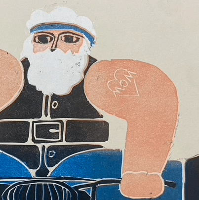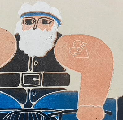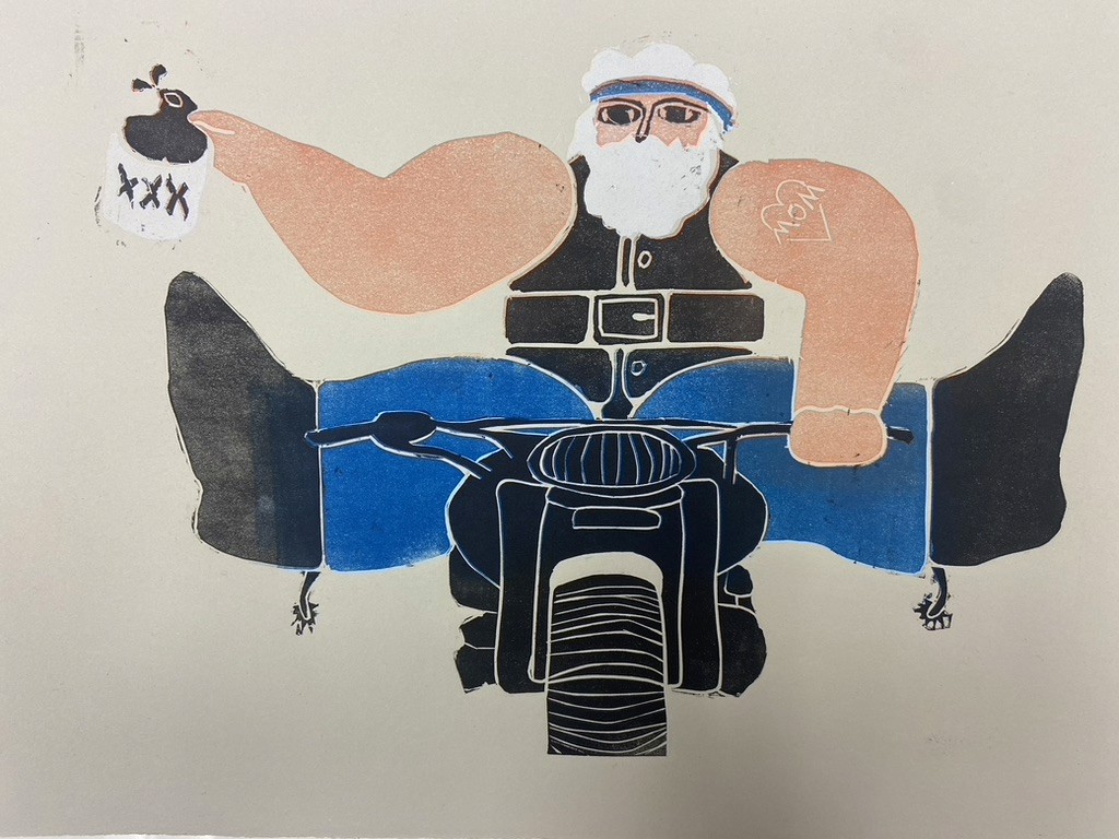 "Free Bird" is a linocut print. In this process the first layer of the design is carved out of linoleum. Color is then applied like a stamp and printed through a press. The following layers are then carved out sequentially into the linoleum to create the final image. This process cannot be reprinted after the following layer is carved. When finished you are left with the final layer carved out and ready to be disposed of. The design was based on an old Portuguese stamp depicting Santa Clause.